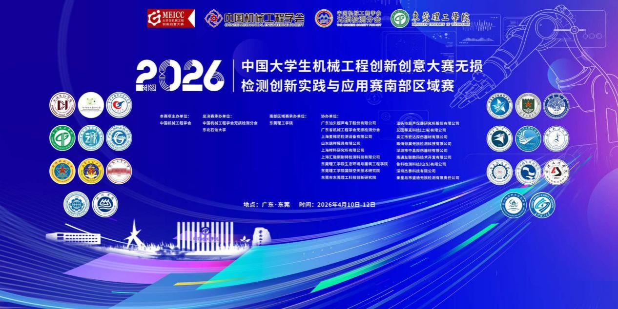 芳菲四月,莞邑飘香;松湖之畔,英才汇聚。4月10日—12日,2026年中国大学生机械工程创新创意大赛无损检测创新实践与应用赛南部区域赛在东莞理工学院松山湖校区成功举办。本次大赛由中国机械工程学会主办,中国机械工程学会无损检测分会、东莞理工学院承办,广东汕头超声电子股份有限公司、广东省机械工程学会无损检测分会等18家单位协办。生态环境与建筑工程学院、国际空天技术研究院、东莞市东莞理工科技创新研究院三方联合筹...