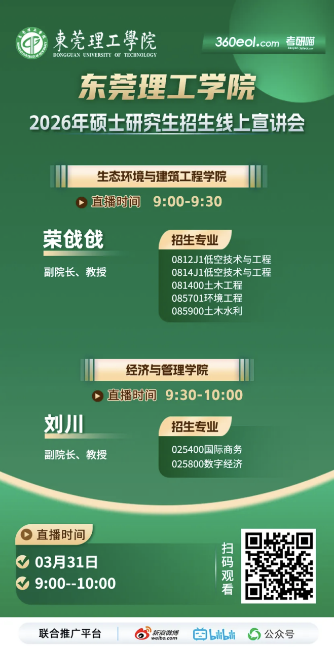 为更好服务广大考生,畅通招生咨询渠道,助力学子详细了解我院研究生招生政策、招生专业特色、人才培养情况信息,东莞理工学院生态环境与建筑工程学院2026年硕士研究生招生线上宣讲将于3月31日9:00-9:30线上直播,同时开通招生专业咨询电话和QQ咨询群,欢迎广大考生咨询报考!