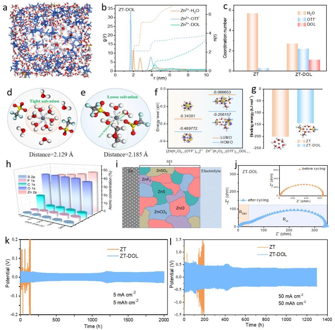 水系锌离子电池因其安全性高、成本低、环境友好等优势,在大规模储能领域具有广阔前景。然而,锌负极在水系电解液中易发生枝晶生长和副反应,导致循环寿命短、库仑效率低,严重制约其实际应用。针对该难题,研究团队创新性地引入低介电常数共溶剂1,3-二氧戊环(DOL),构建了独特的[Zn2+(H2O)2.7(OTf−)2.2DOL1.1]溶剂化结构,有效减少了配位水分子数量,拉长了Zn2+–H2O键长,降低了水的还原活性,从而显著抑制析氢反应和枝晶生长。该研究进一步揭示了DOL调控溶剂化结构的协同机制:低介电常数促进阴离子进入配位层,形成富阴离子溶剂化结构;空间位阻效应拉长Zn2+–H2O键距,提升水分子的LUMO能级;同时促进形成富含ZnF2、ZnS、ZnO等无机物的稳定固态电解质界面膜。得益于此,锌负极在50 mA cm−2、50 mAh cm−2、68.9%放电深度的极端条件下实现了1300 h的稳定循环,累积电镀容量达创纪录的32.5 Ah cm−2。组装的全电池(Zn/NaV3O8·1.5H2O)在2000次循环后仍保持95.2%的容量。该策略还适用于1,2-二甲氧基乙烷、苯甲醇和四氢呋喃等具有相似物化性质的共溶剂,展现出良好的普适性。该研究不仅为高性能水系锌离子电池的电解液设计提供了新思路,也展示了静电调控在金属负极界面工程中的广泛应用潜力。