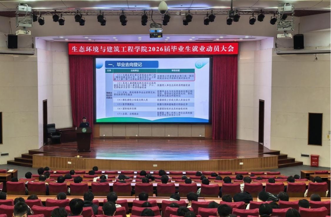为切实做好2026届毕业生就业指导服务工作,帮助学生转变就业观念,提高就业能力,尽早谋划职业道路,生态环境与建筑工程学院于12月25日下午在学术会议中心报告厅召开2026届毕业生就业动员大会。学院党委书记兰善红、党委副书记诸小妮、毕业年级辅导员出席会议,2026届400多名毕业生参加会议,会议由诸小妮副书记主持。首先,辅导员胡胜老师围绕毕业生事务、就业信息填报等相关事项进行详细讲解,从学分自查、就业信息获取、毕业...